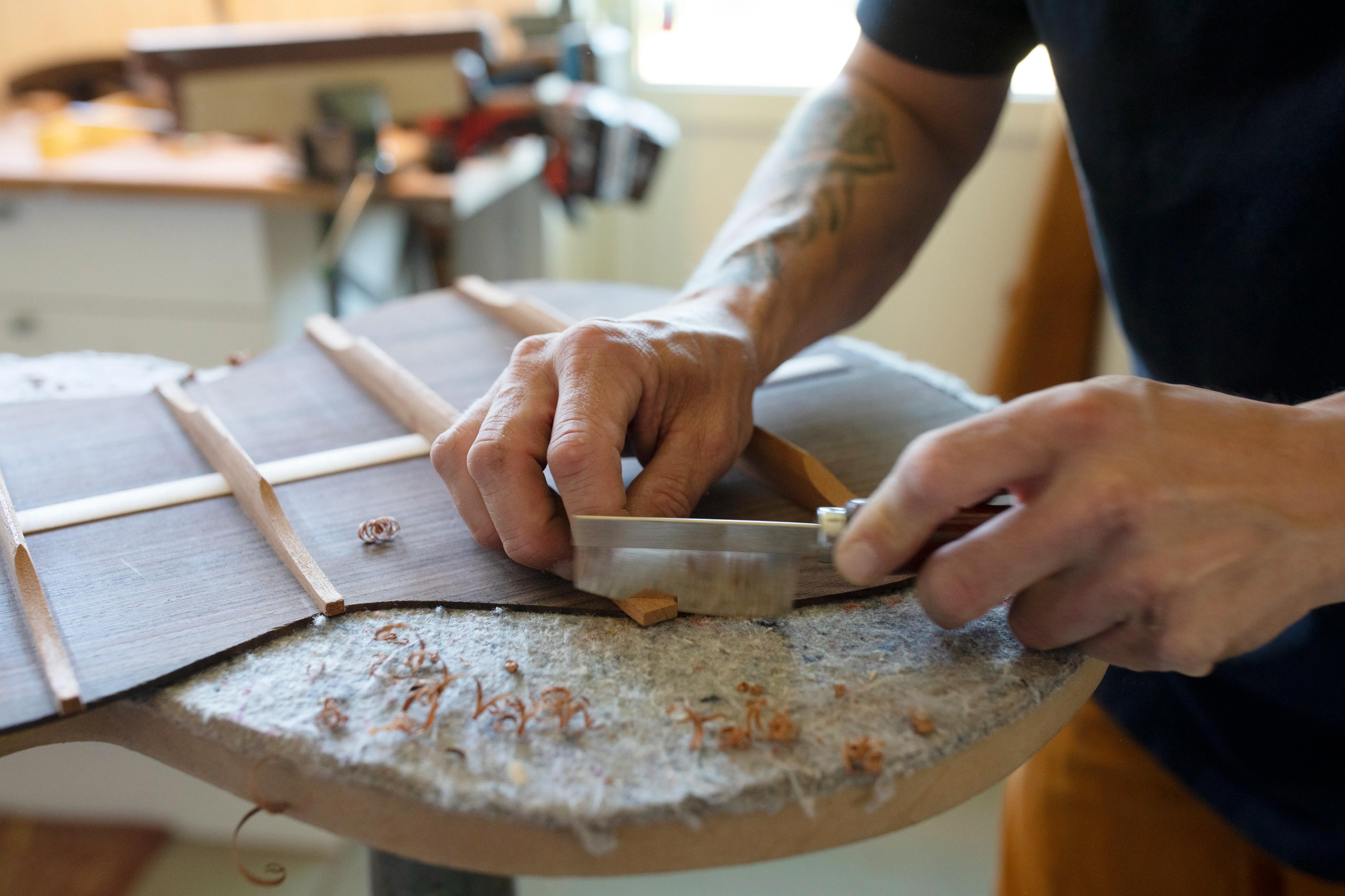 – The most fun part is the brace shaping, says David. He continues, that's when I decide on the instrument's voice. I am able to determine to a great extent the result of the guitar's sound at that very moment. Sure, all of the steps combined steer the end result in a specific direction (the guitar should function as a unit) but that’s the moment that requires extra focus and concentration. So, if I have a bad day, it's not a good idea to take on this part of the job.